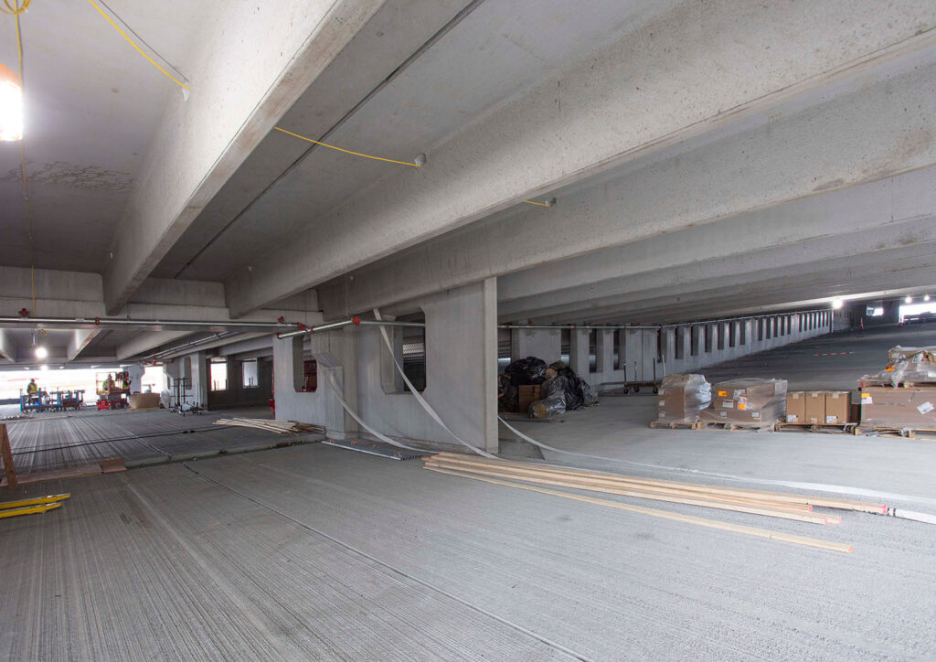 A successful conversion to precast concrete proved pivotal in overcoming the project’s logistical and structural challenges. Dailey Precast, LLC manufactured a total of 1,180 precast concrete elements for the new parking structure, including columns, double tees, flat slabs, shear walls, and more, which provided the speed and flexibility required to meet both structural and functional needs. This allowed the parking structure to be erected quickly, addressing the need for efficient construction while accommodating the fire station and electrical areas at the lower levels.